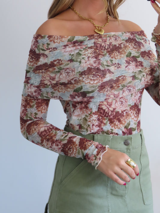 Wildflower Whispers Mesh Off-Shoulder Knit Bodysuit
