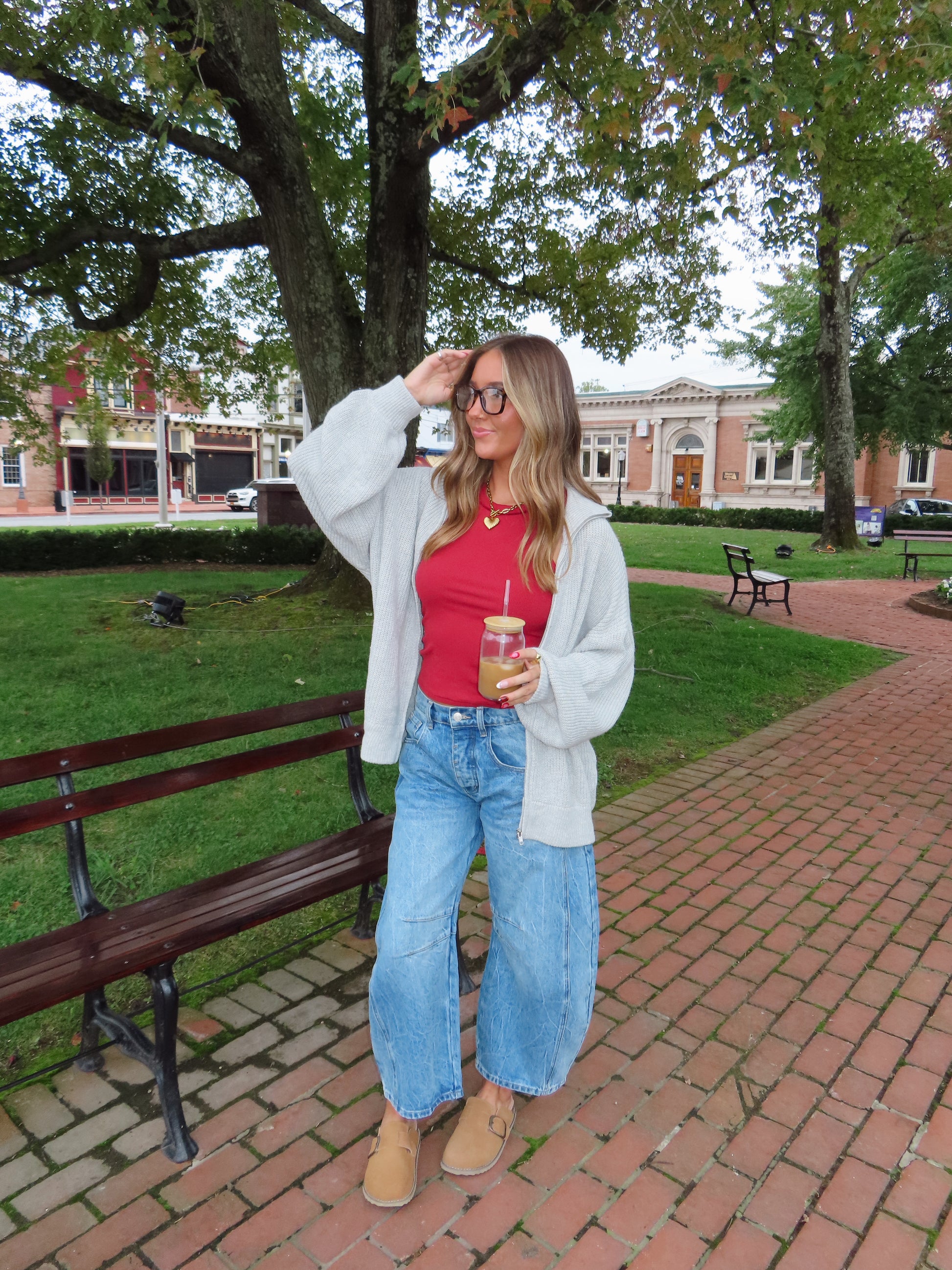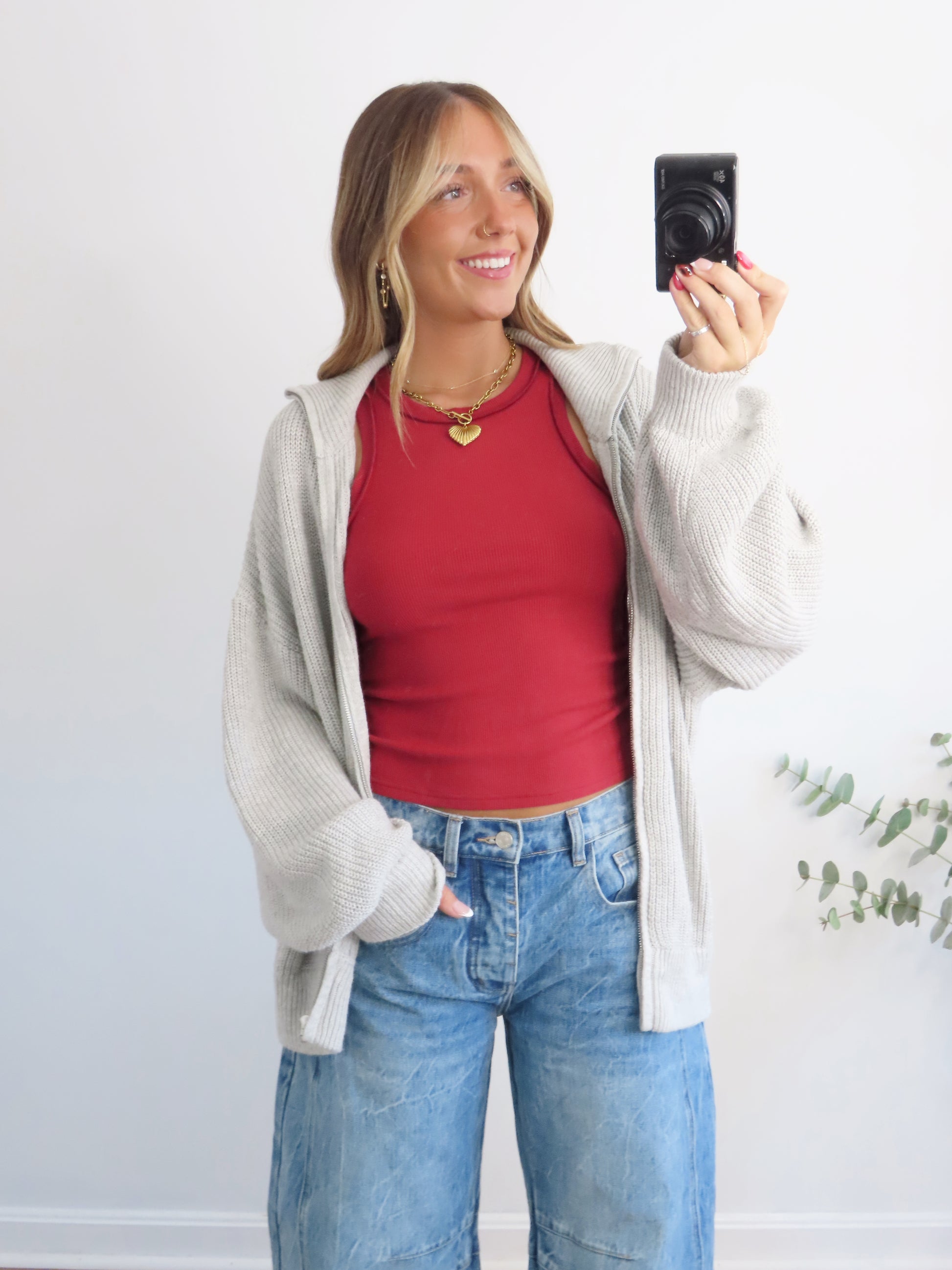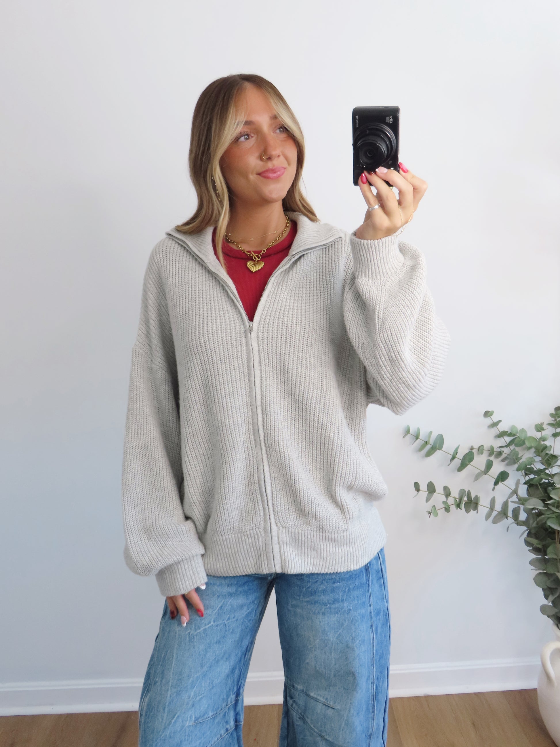 A cozy zip up sweater in grey, designed with a relaxed fit and ribbed knit texture. Featuring balloon sleeves and a laid-back silhouette, it’s the perfect layering piece for casual days and cool nights.