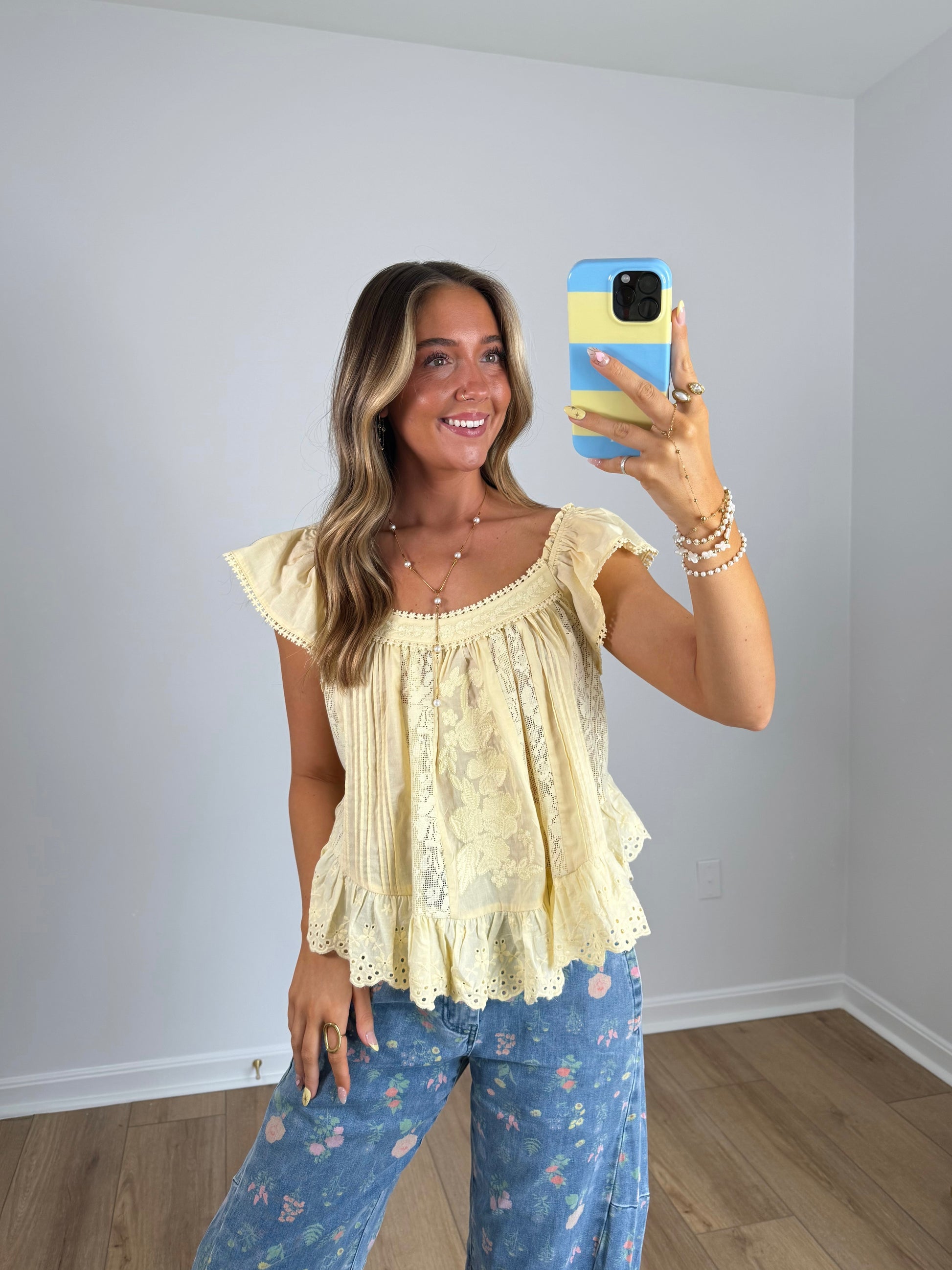 The kind of top that instantly makes everything feel softer ✨ This butter yellow lace top features delicate vintage-inspired detailing, flutter sleeves, and a flowy silhouette that moves with you. The lightweight fabric and intricate lace panels give it that effortless, one-of-a-kind feel you’ll reach for again and again.