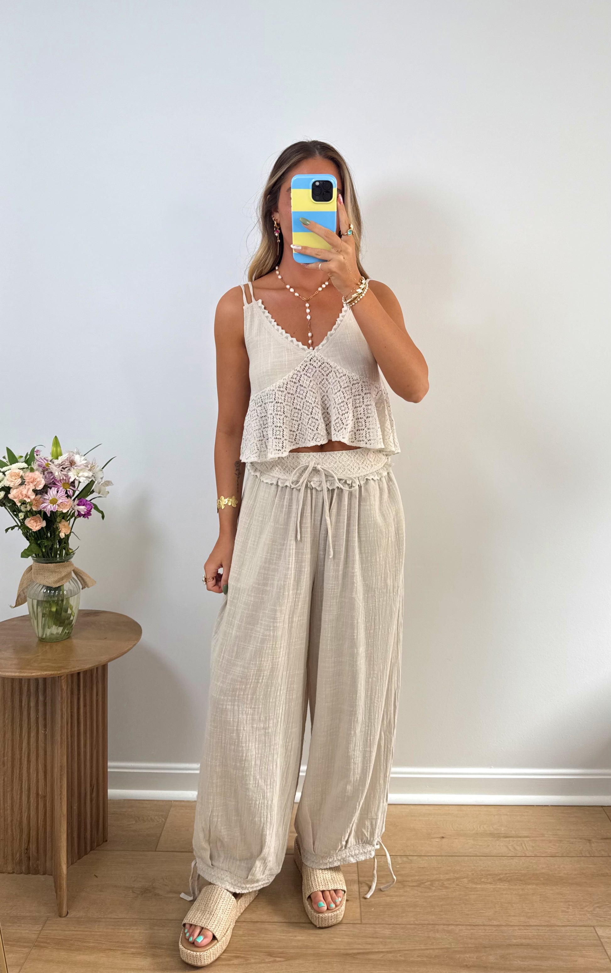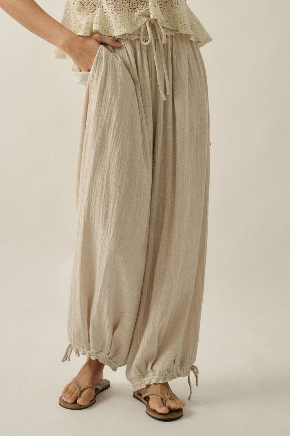 A soft, airy pant featuring a relaxed silhouette, elastic waistband, and adjustable ankle ties. Effortless, flattering, and easy to style.