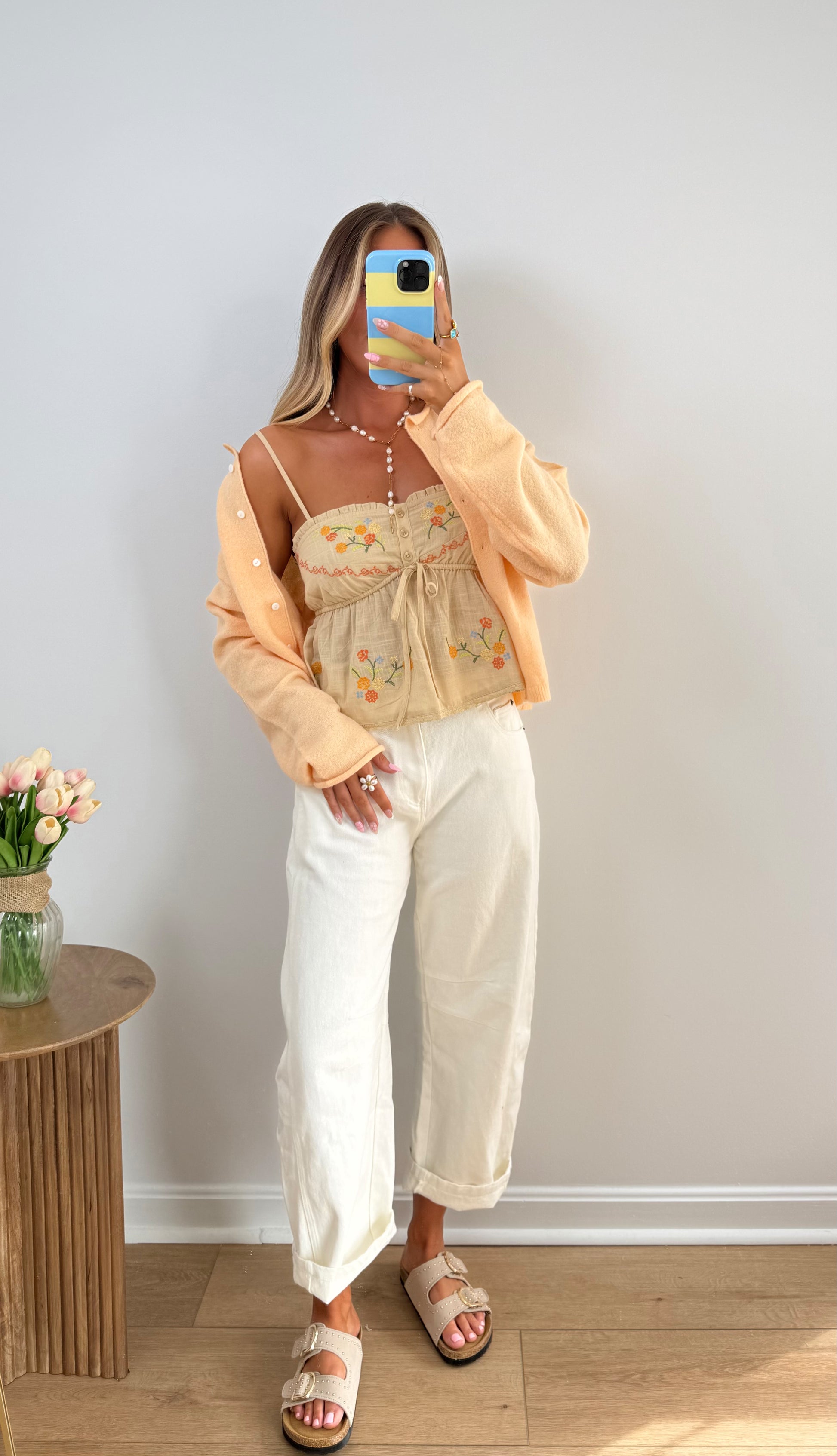 Lightweight babydoll tank with delicate floral embroidery and the sweetest lace trim details. Features a flowy fit with adjustable straps and a soft, airy feel. Perfect for warm days styled with denim for an effortless, feminine look.