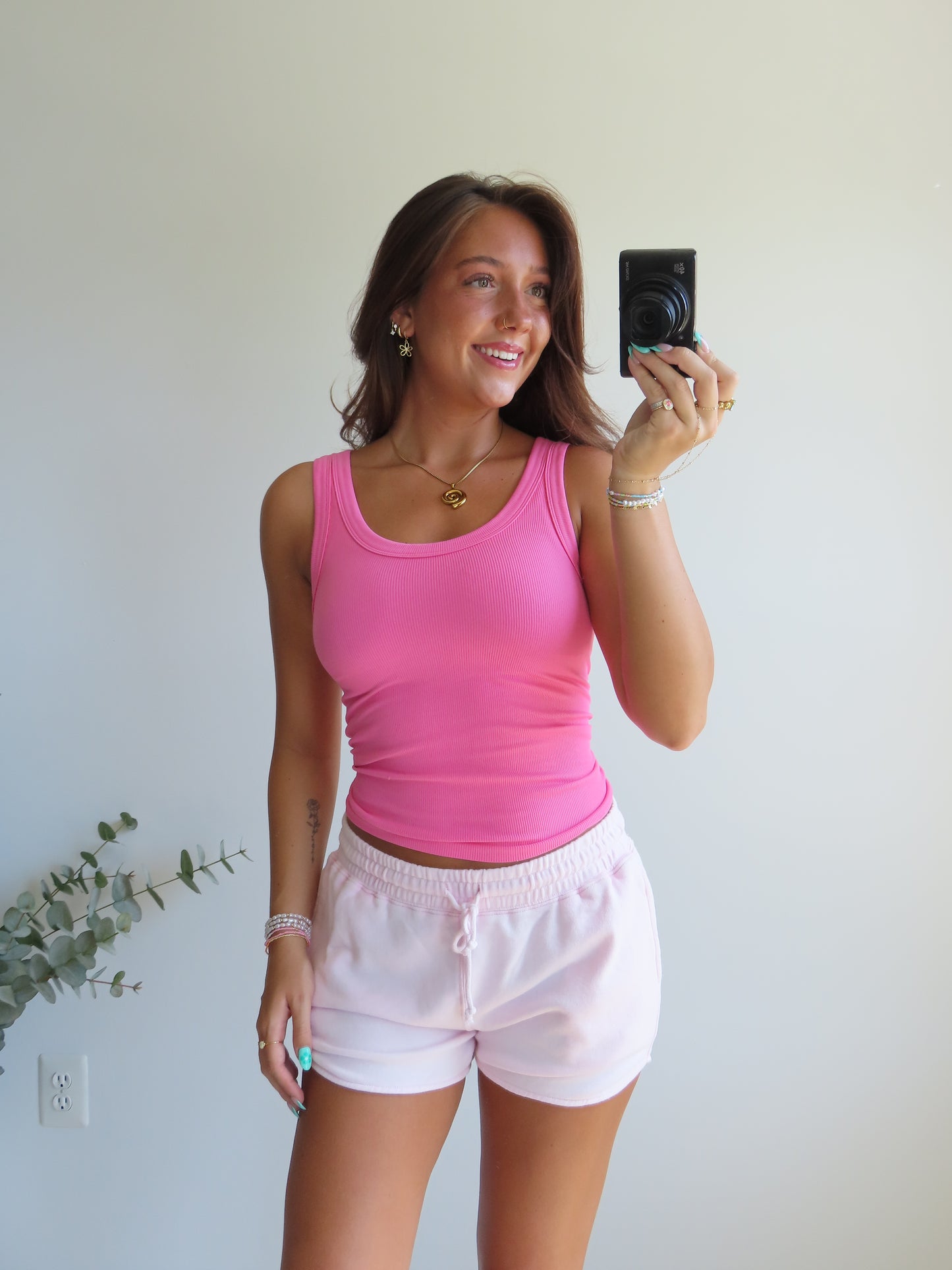 A reversible ribbed knit tank top that can be worn as a scoop neck or turned around to be worn as a crew neck.