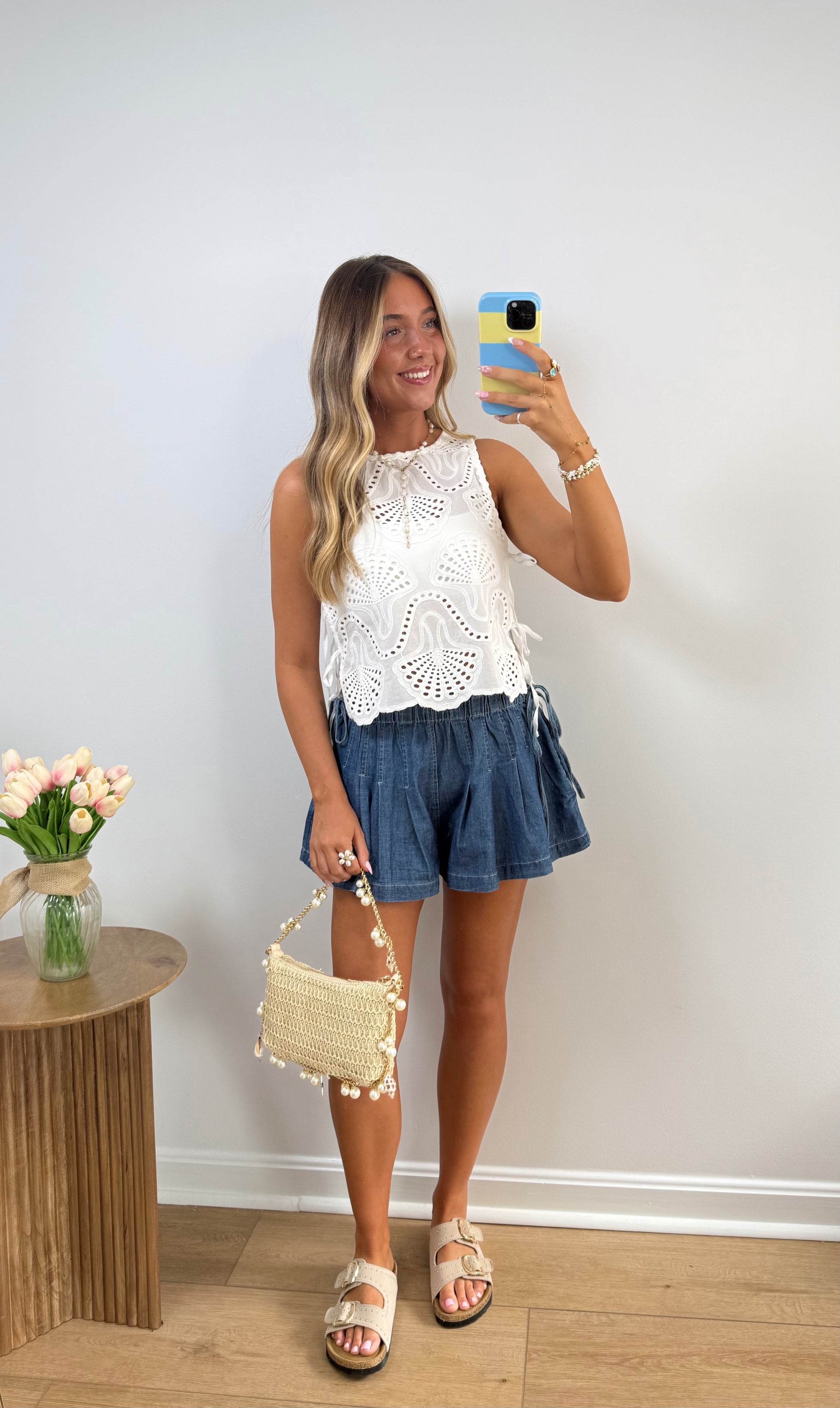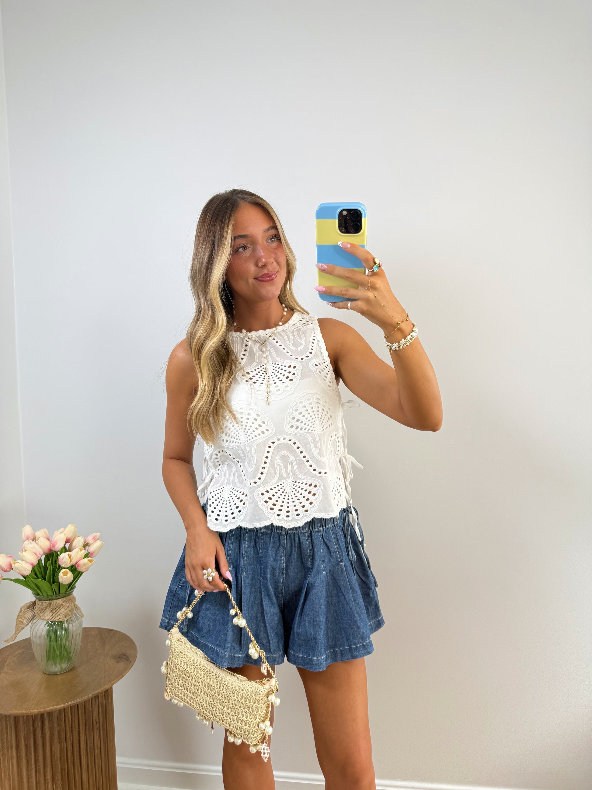 Delicate lace top with intricate cutout detailing and a soft, airy feel. Features adjustable side ties and a relaxed, slightly cropped fit for an effortlessly feminine look. Perfect for pairing with denim for an elevated everyday outfit.