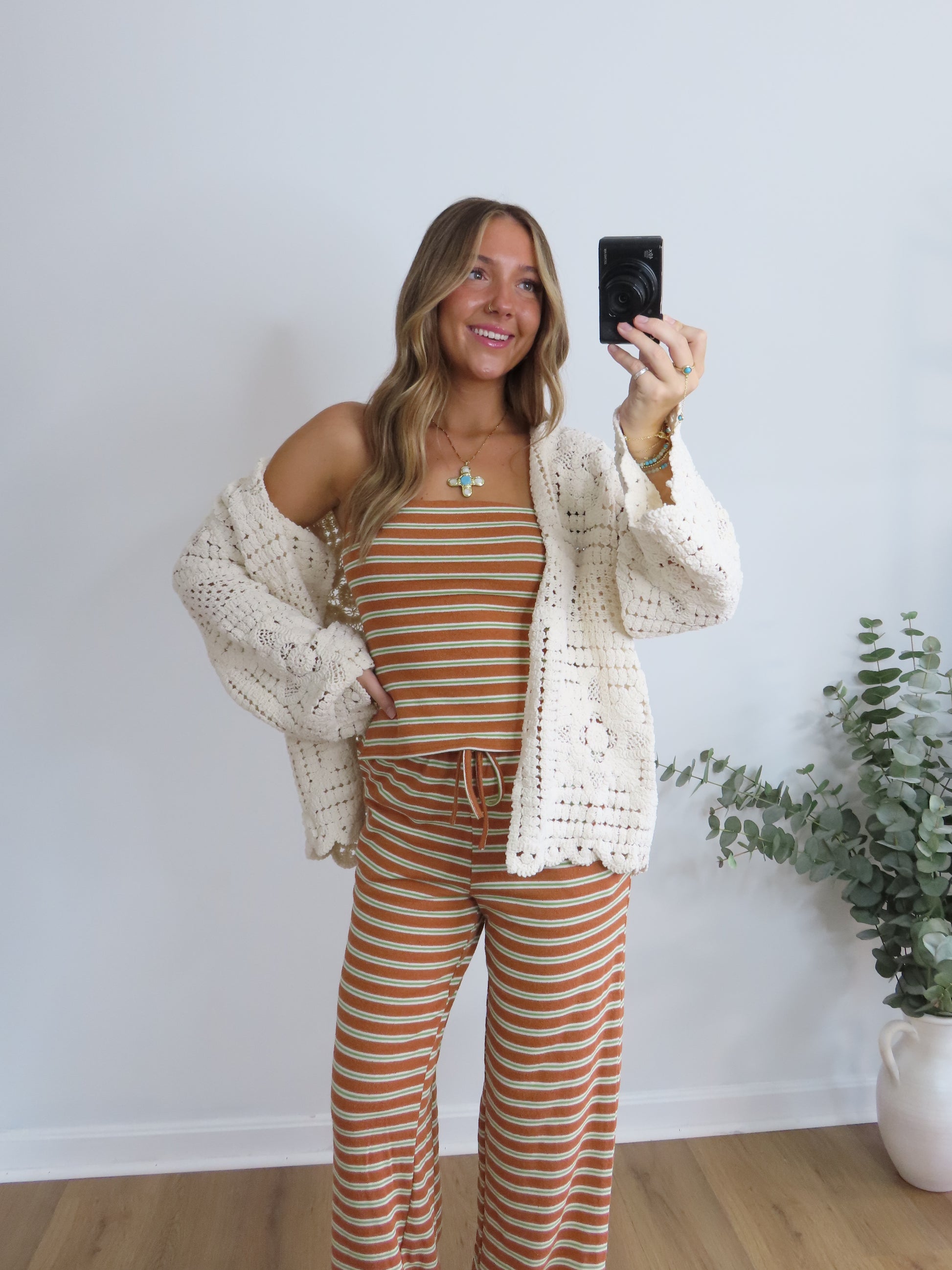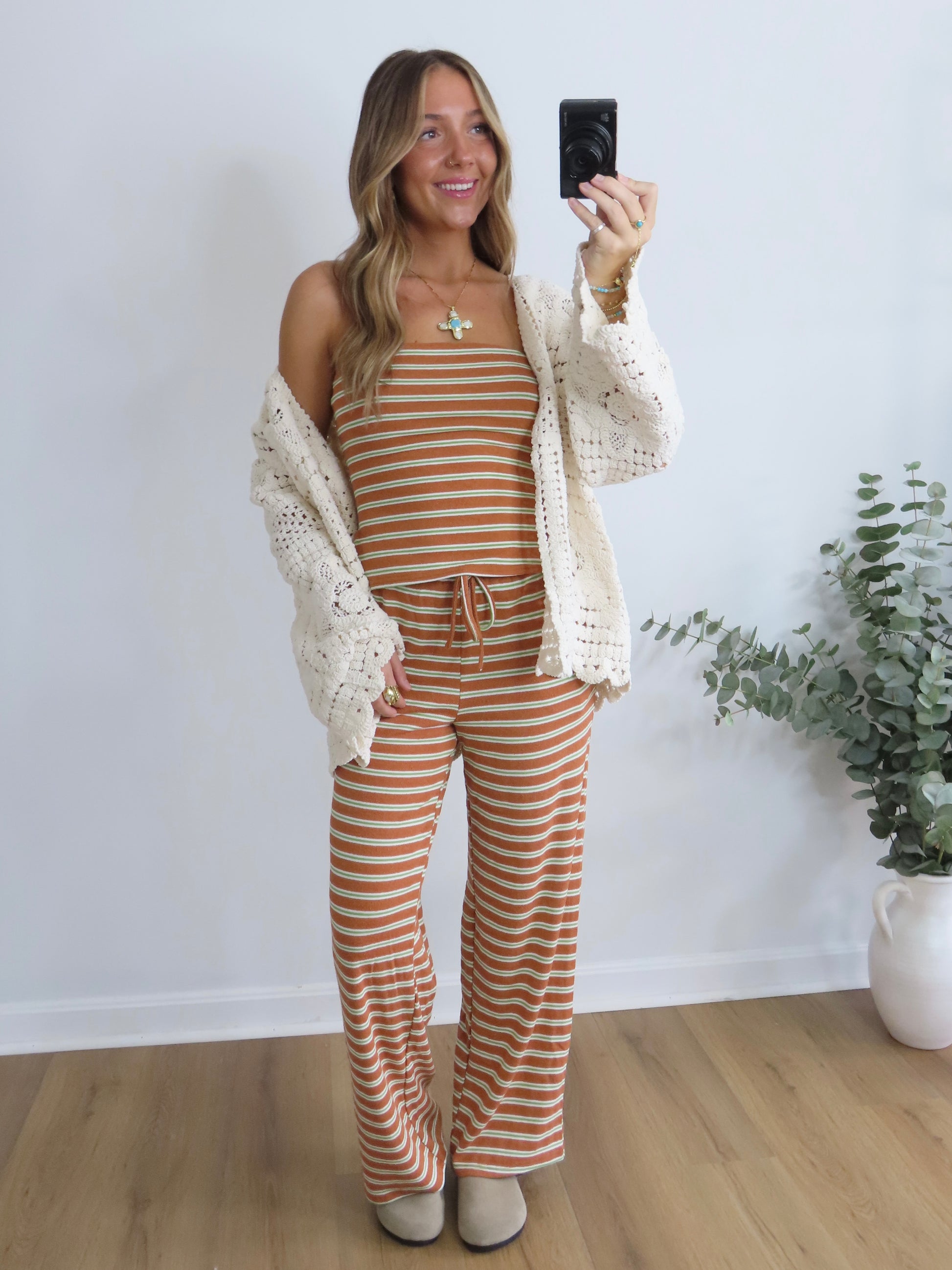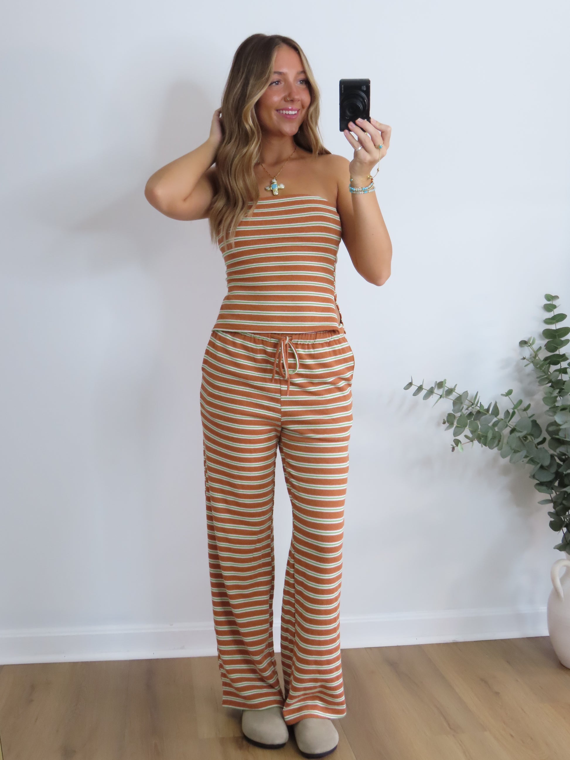This striped lounge set is the definition of laidback cute. Featuring a stretchy tube top and matching wide-leg drawstring pants in a vintage-inspired rust, green and cream stripe, it’s perfect for chill days, travel fits, or lounging in style. Soft, comfy, and effortlessly fun.