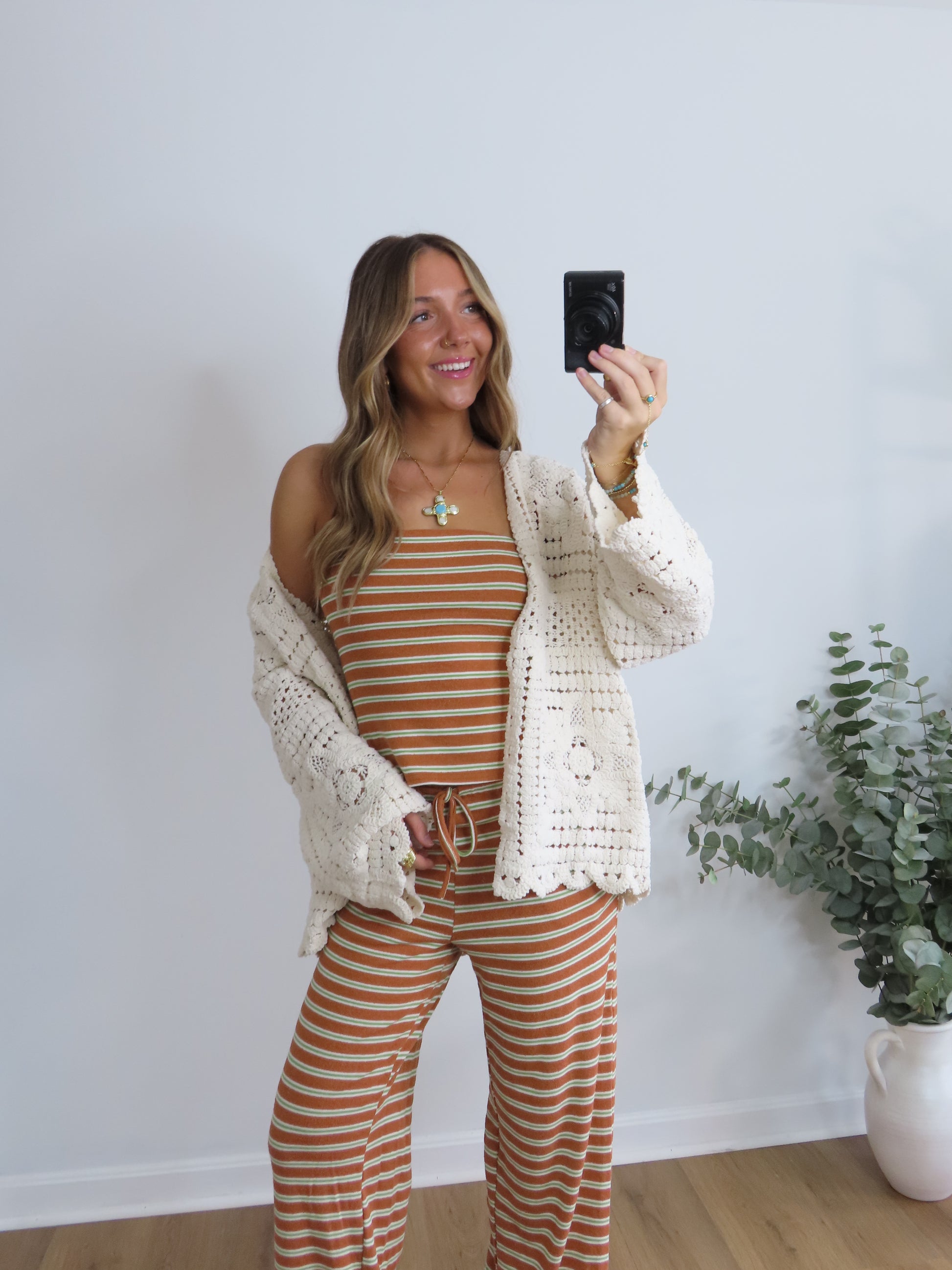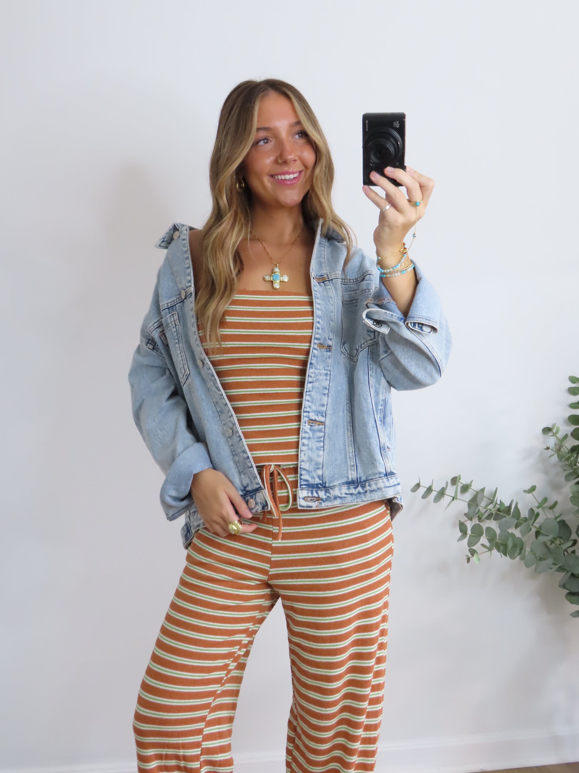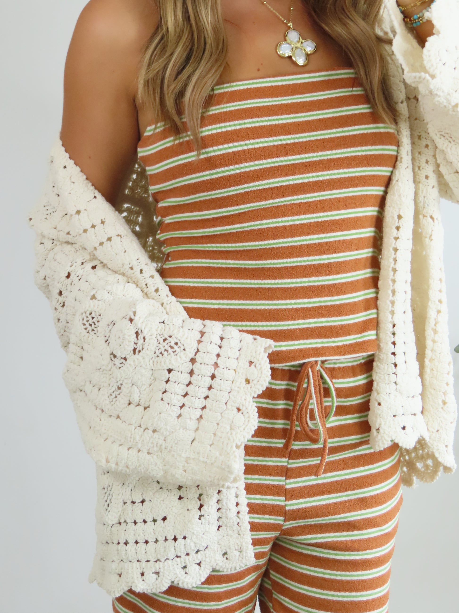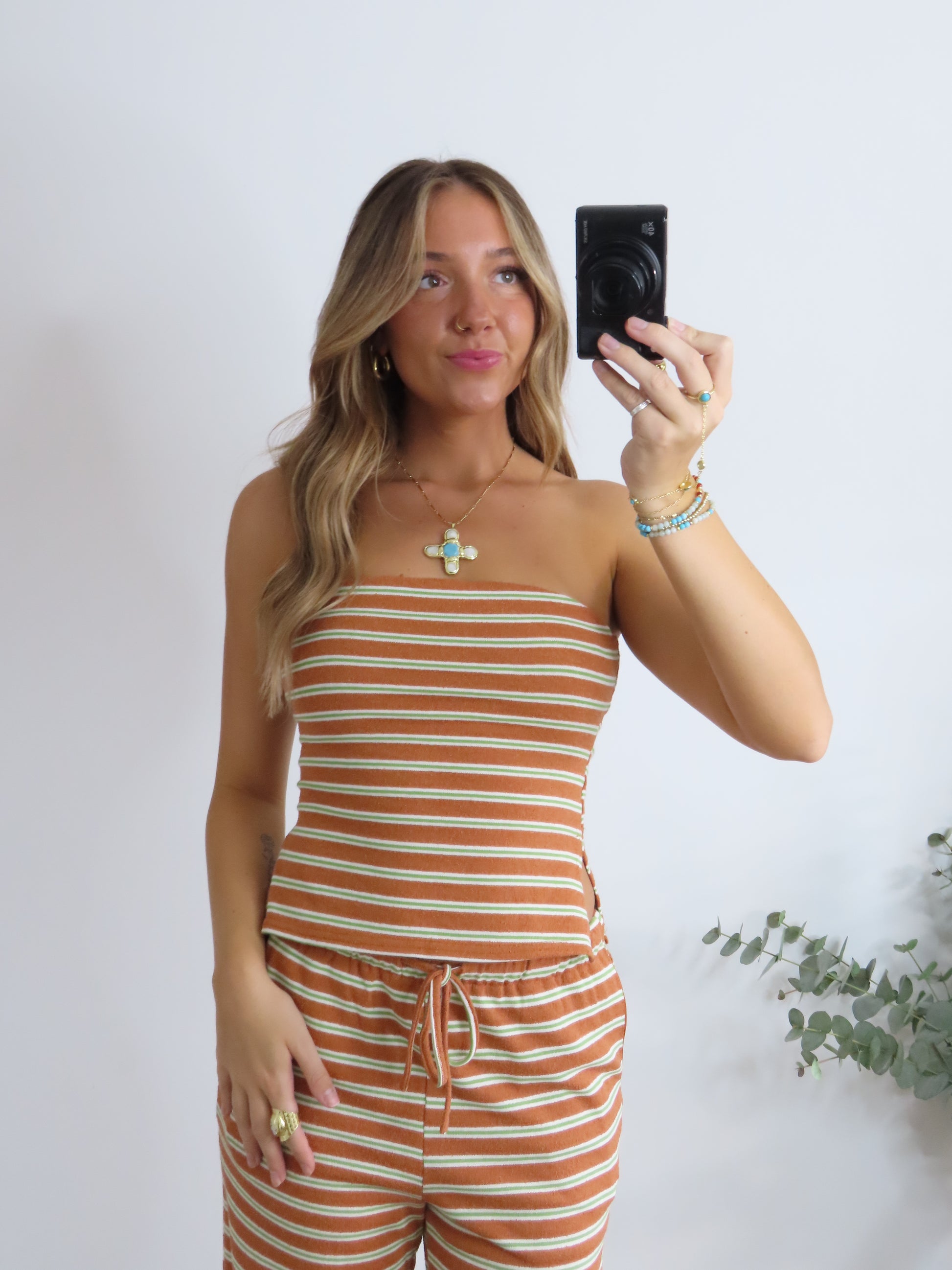 This striped lounge set is the definition of laidback cute. Featuring a stretchy tube top and matching wide-leg drawstring pants in a vintage-inspired rust, green and cream stripe, it’s perfect for chill days, travel fits, or lounging in style. Soft, comfy, and effortlessly fun.