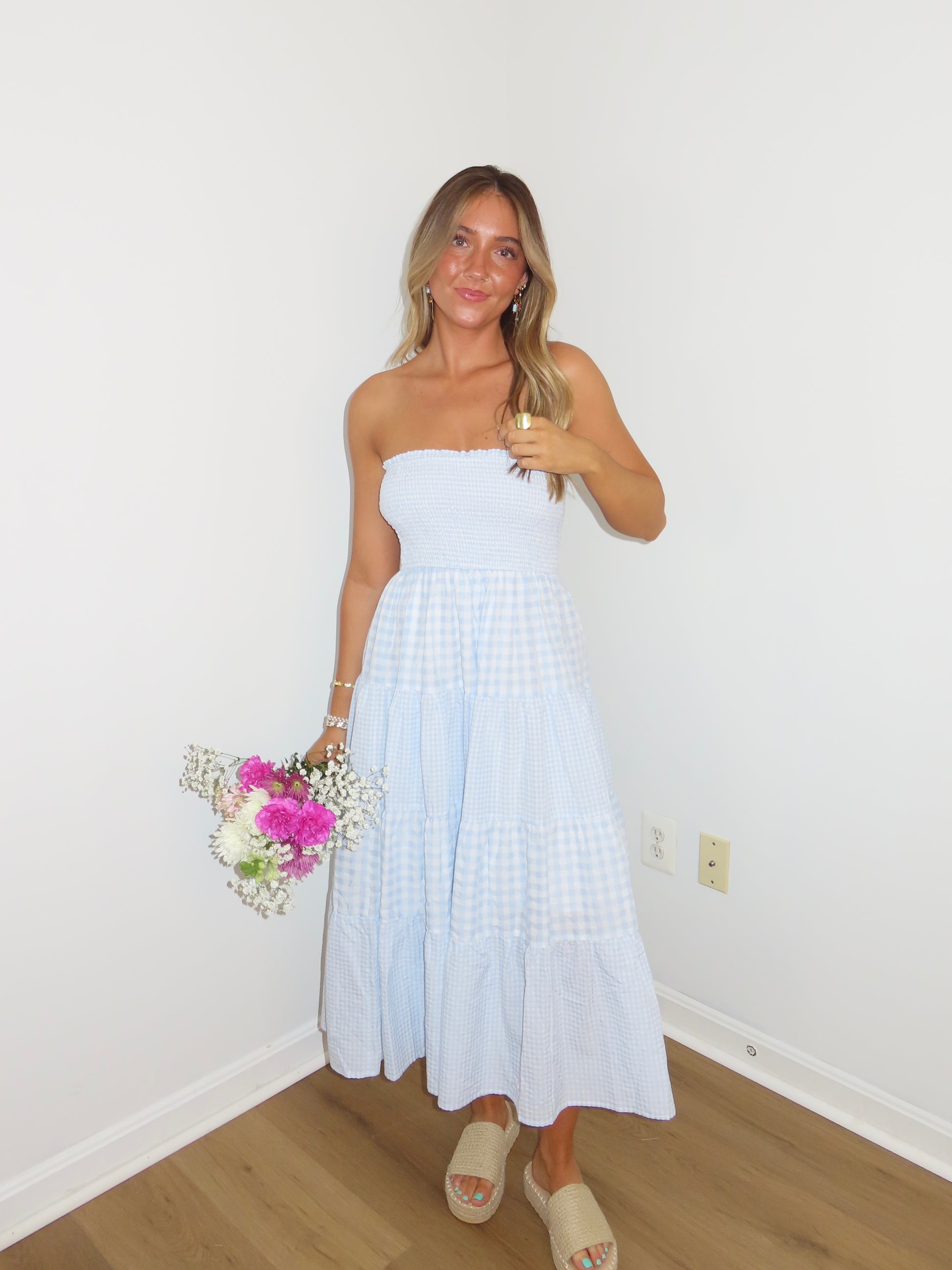 A dreamy blue gingham midi dress featuring a stretchy smocked bodice and flowy tiered skirt. Lightweight, feminine, and made for sunny days.