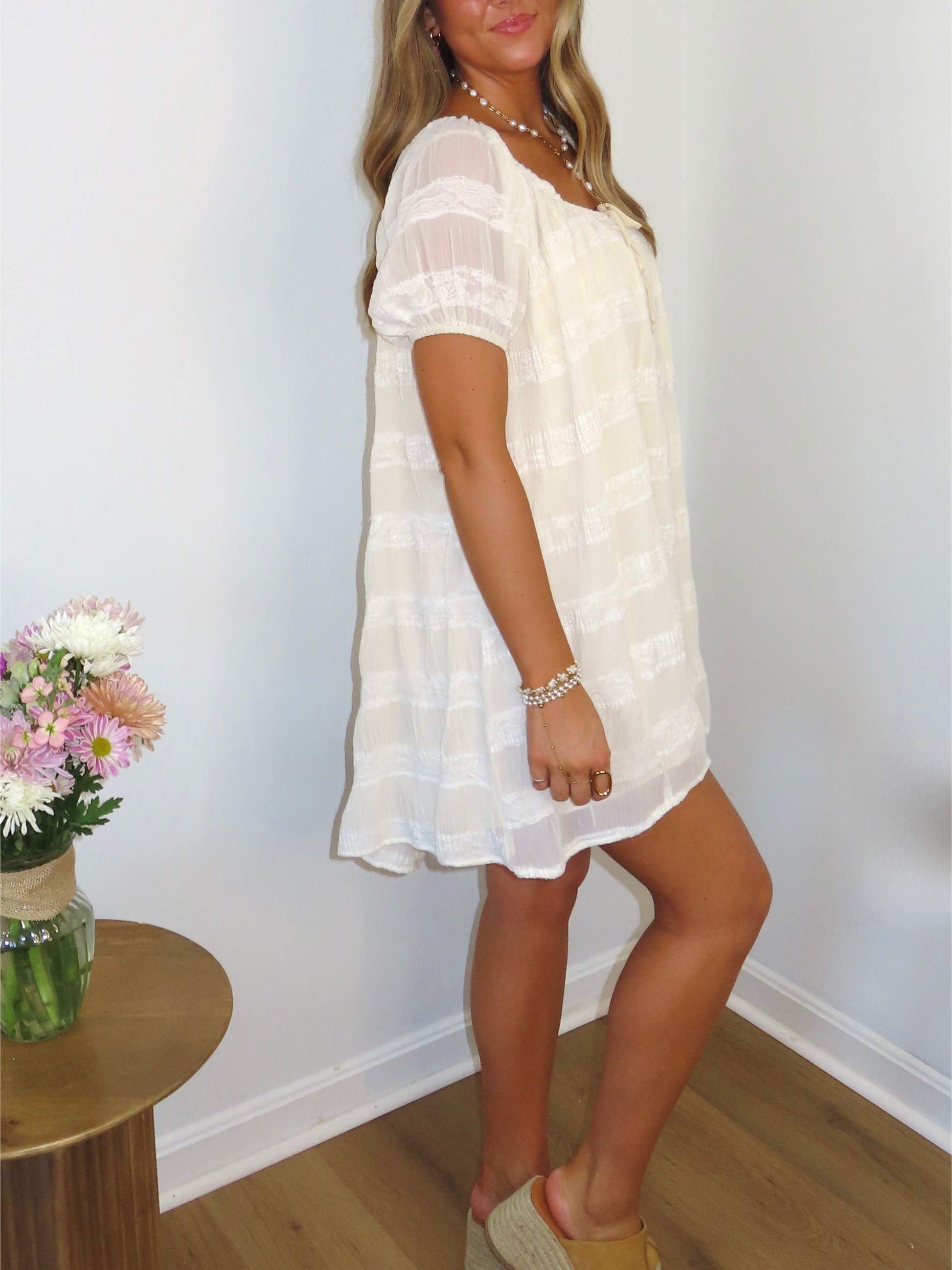 A soft, flowy mini dress featuring delicate lace details, short sleeves, and a relaxed breezy fit. The perfect effortless piece for sunny days and sweet spring moments.